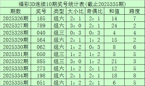 开奖追想:福利彩票3D第25335期奖号开出051。奖号类型为组六,奇偶景观为偶奇奇,大小景观为小大小。