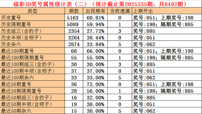 福彩3D第2025333期奖号为273,第2025335期奖号为051,隔期奖号莫得出号。从统计表均分析,最近100期隔期奖号出现55期,出现比例为55%,最近50期隔期奖号出现28期,出现比例为56%,最近10期隔期奖号出现 4期,出现比例为40%,本期提神隔期号中号码轮空。