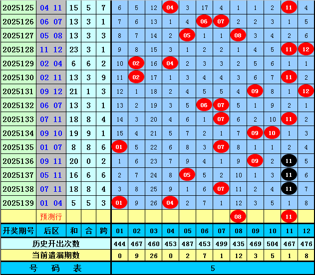 后分歧析:上期后区开出奖号01和04,在最近50期开奖中,后区奖号012路落号比为26:37:37,前10期后区012路落号比为5:8:7,本期后区珍贵号码05、08、09、10、11,两码参考08、11。