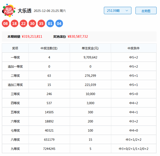 大乐透第2025139期开奖,前区:08、18、22、30、35;后区:01、04。其中前区012路比为2:1:2,奇偶比为1:4,和值为113,跨度为27,后区开出1路+1路号码。