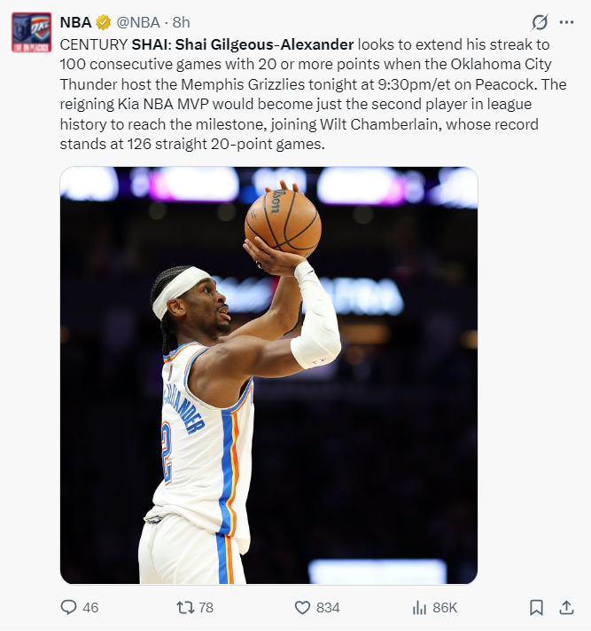 赛前NBA官方预热SGA的一项数据,只好他这场对阵灰熊拿到20+,那么他将成为NBA历史上第二位招引100场20+的球员,仅次于张伯伦的招引126场20+,SGA的得分稳重性真实是太强。