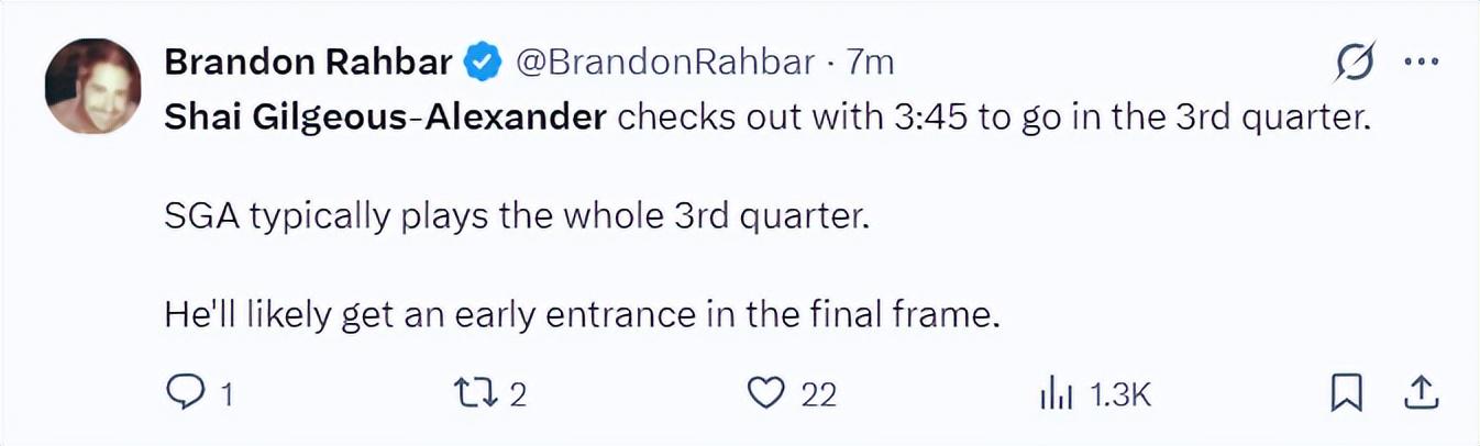 但第三节SGA的手感欠安3中0,只依靠罚球拿到2分,三节打完SGA共计19分,他第三节还剩3分45秒被替换下场,但雷霆记者布兰登-瑞贝尔写谈:一般来说小节会让SGA先发,他细目会立马拿分完成20+。