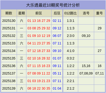 前区012路分析:前区上期012路比为2:1:2。