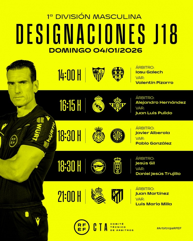 1月3日讯 西甲官方公布了1月4日比赛的裁判安排,埃尔南德斯王法皇马vs贝蒂斯。