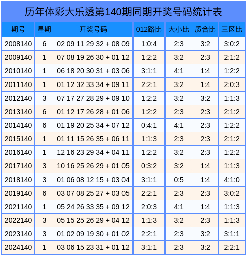 其中前区的012路比为2:1:2,三区比为2:2:1,大小比为4:1、质合比为0:5。