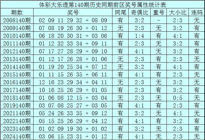 体彩大乐透第140期历史同时开出16次奖号,其统计详见下表: