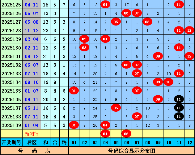 后分辨析:上期后区开出全1路号码01和04,最近30期后区奖号012路比为14:21:25,最近10期后区奖号012路比为5:8:7,本期后区防卫号码04、06、08、10、12,单挑两码组合04、06。