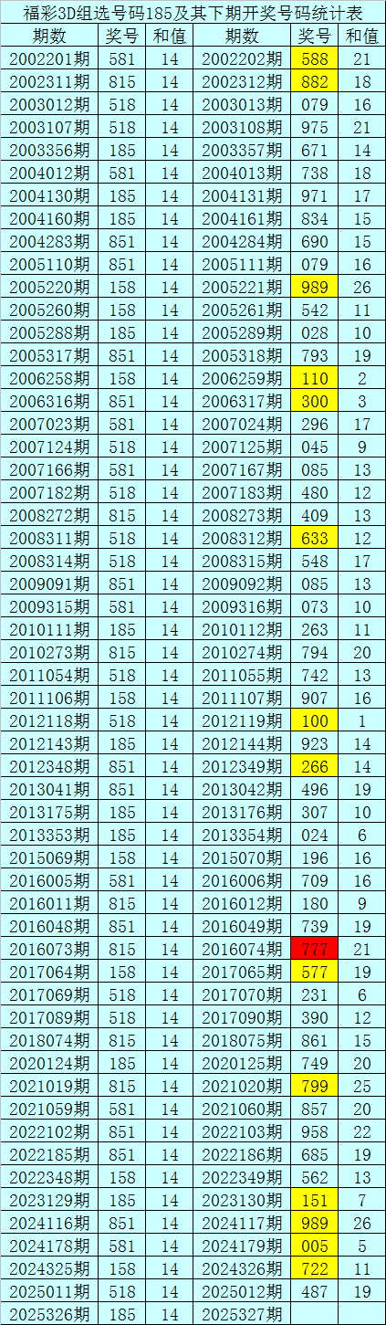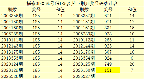 二、组选分析:历史上组选号码185开出了56次,其下期奖号离别为:588-882-079-975-671-738-971-834-690-079-989-542-028-793-110-300-296-045-085-480-409-633-548-085-073-263-794-742-907-100-923-266-496-307-024-196-709-180-739-777-577-231-390-861-749-799-857-958-685-562-151-989-005-722-487,其开出期数和下期奖号统计为: