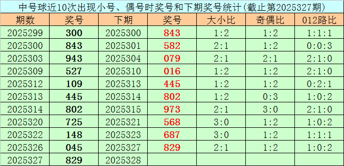 中号球:上期奖号为2,开出小 号、偶号,该位前10次开出小 号、偶号的气候时其奖号鉴识为:300、843、943、527、109、445、802、725、148、045,其中中号球012路比为3:5:2。