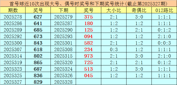 开奖追想:体彩罗列三第2025327期开出奖号829,奖号大小比开出2:1,奇偶比开出1:2,012路比开出1:0:2。