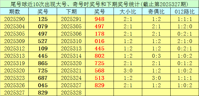 在尾号球前10次开出大号、奇号类型之后,其下期鉴识开出奖号:948、497、178、016、445、802、725、568、513、829,其中号码012路比为3:1:6,奇偶比为5:5,大小比为8:2。