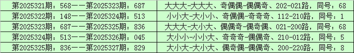 统计罗列三已开出的奖号发现,在聚拢5期(第2025321期-第2025325)奖号为:568-148-687-513-836。