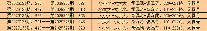 在罗列三历史开奖中,第2023134期-第2023138期聚拢5期奖号为:220-467-929-791-440。