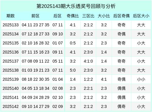 大乐透第25142期开出奖号:09、10、14、27、29 + 02、09。其中前区号码三区比为2:1:2,奇偶比为3:2,大小比为2:3,后区开出偶数+奇数、少许+大数。