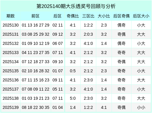 大乐透第25139期开出奖号:08、18、22、30、35 + 01、04。其中前区号码三区比为1:2:2,奇偶比为1:4,大小比为4:1,后区开特等数+偶数、少许+少许。