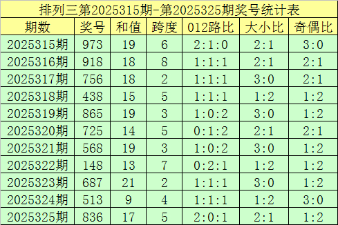开奖追想:胪列三第2025325期奖号开出:836,组选类型:组六,大小比为2:1,奇偶比为1:2,和值为17,跨度为5。