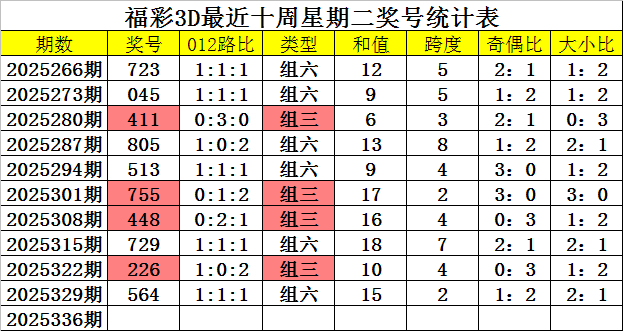 奖号类型分析:从近期周二开奖数据分析,组六号码最近十周出现6次,推崇较冷,上周二开出组六,组三开出4次,推崇相对较热,本周二预测组六号码回补。