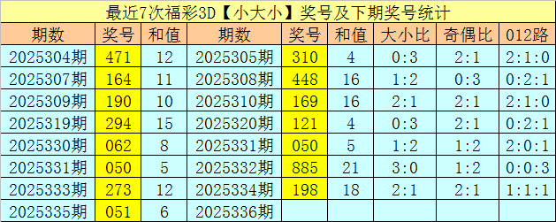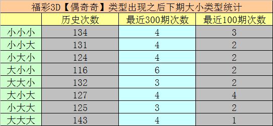 一、福彩3D上期奖号为051,大小类型开出:小大小,历史上该大小类型奖号共出现1033次,最近7次【小大小】奖号分辩开出:471、164、190、294、062、050、273,其中组三号码出现1次,组六号码出现6次。