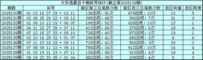 体彩大乐透第25139期奖号开出:08 18 22 30 35+01 04,前区奖号大小比为4:1,012路比为2:1:2,奇偶比为1:4,后区号码和值为5,跨度为3。