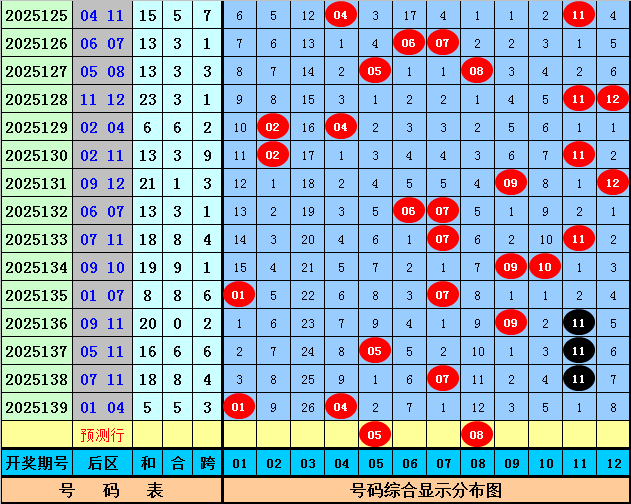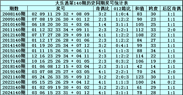 后差别析:在第140期历史同时开奖中,后区奖号一奇一偶出现12次,全奇出现3次,全偶出现1次,本年第140期后区瞻望出现一奇一偶组合,看好两码05和08。