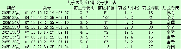 大乐透第25139期奖号为:08、18、22、30、35+01、04。其中前区和值为113,奇偶比为1:4,大小比为4:1。后区为全小、一奇一偶组合。