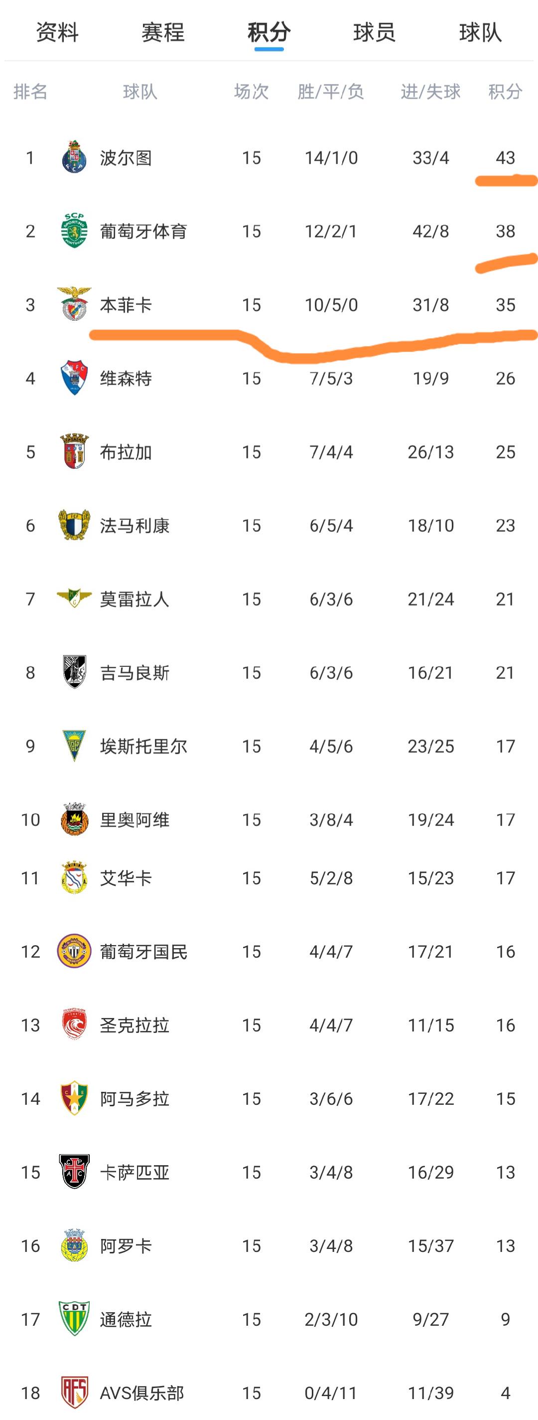 今天凌晨,葡超第15轮规则了终末一场的较量,在这场比赛规则之后,葡超统共18支球队皆一经踢完毕前边15轮的统共比赛,葡超积分榜也随之发生变化,咱们来望望葡超最新积分榜情况。