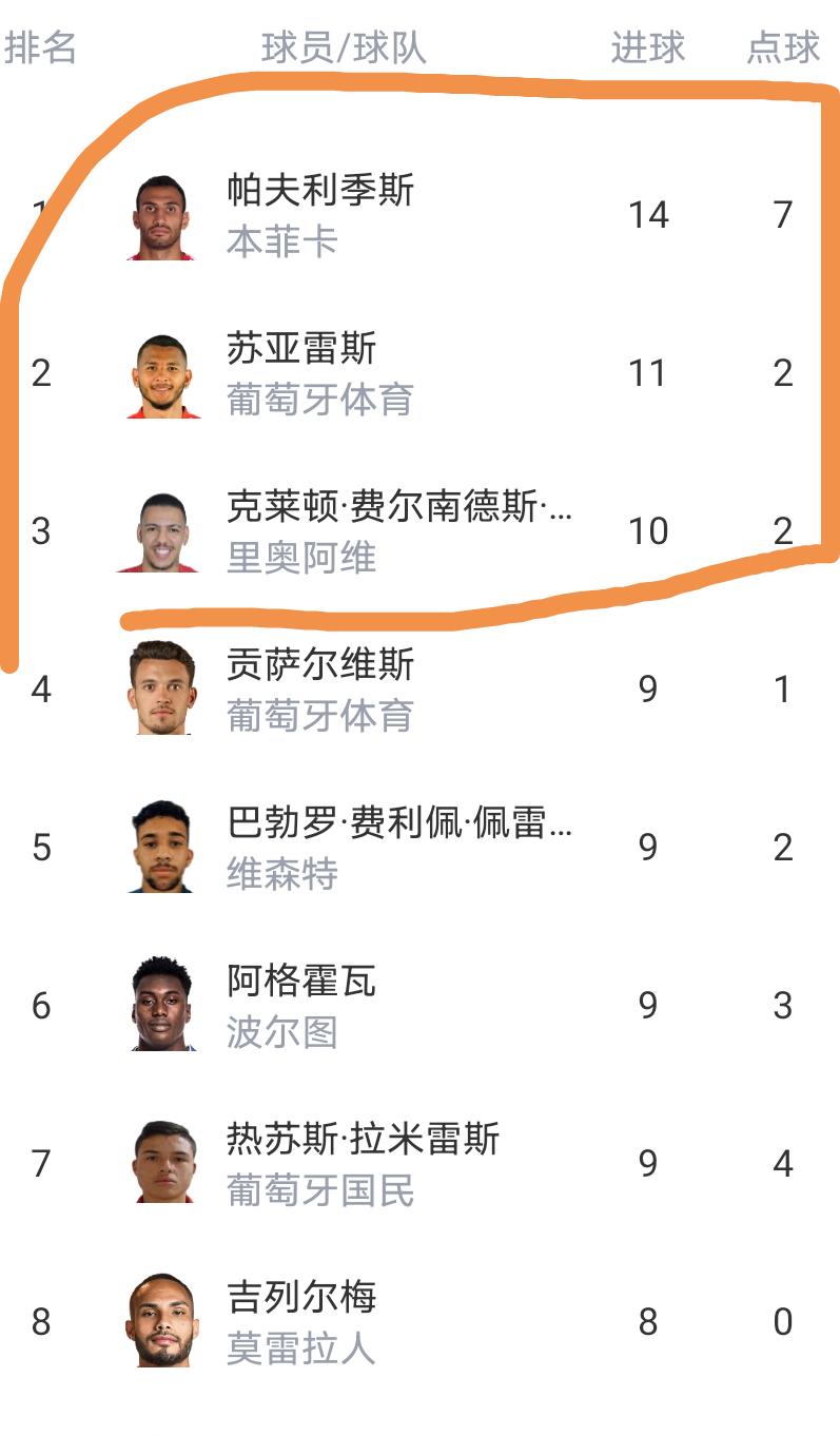 而在弓手榜方面,本菲卡的帕夫利季斯以14球领跑,葡萄牙体育队的苏亚雷斯以11球排行第二,里奥阿维队的克莱顿以10球排行第三,其他球员皆是10球以下。