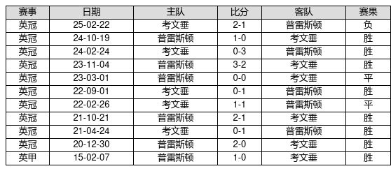普雷斯顿 VS 考文垂两队近10年的交战次数为11场,普雷斯顿8胜2平1负,赢球概率为72.7%,平局概率为18.2%,输球概率为9.1%。