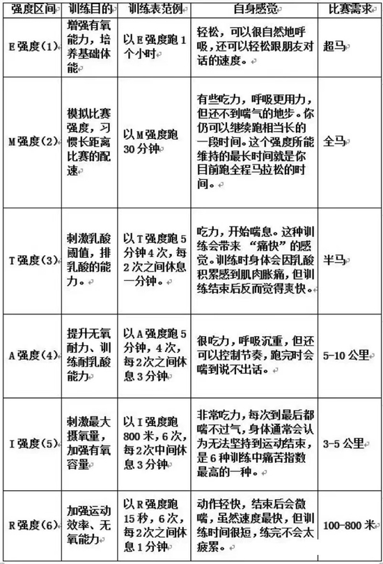 “你念念要考验耐力就第三区(T强度),念念减脂就第一区(E强度),普及最大摄氧量第五区(I强度),短距离速率就第六区(R强度)”。