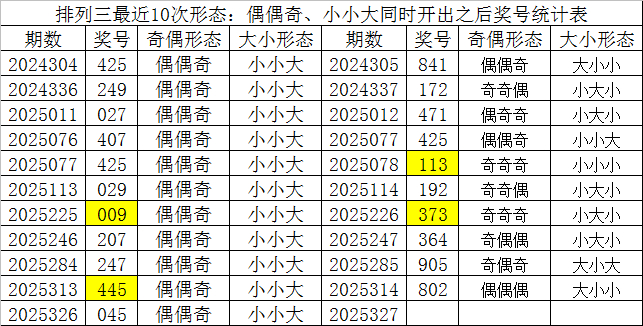 摆设三最近10次同期开特别偶款式:偶偶奇和大小款式:小小大时其奖号分歧为:425-249-027-407-425-029-009-207-247-445-045,下期分歧开出号码为:841-172-471-425-113-192-373-364-905-802,凝视统计见下表: