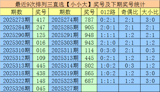 1.成列三第2025326期奖号开出045,大小直选散布为:小小大,在历史开奖中直选【小小大】散布已开出882期,在前9次直选【小小大】散布中,出现奖号为:417-247-125-016-016-109-445-438-148,组三开出1期,组六开出8期。