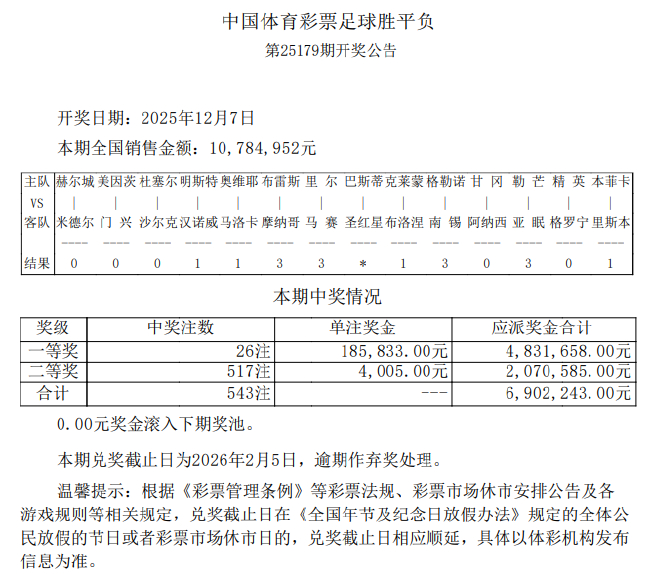 北京本事12月6日,输赢彩第25179期开奖效力揭晓。本期足彩头奖共开出26注,单注奖金185,833元;二等奖开出517注4005元;任九开2749注3611元。本期输赢彩销量为10,784,952元,任九投注总数为15,511,772元。