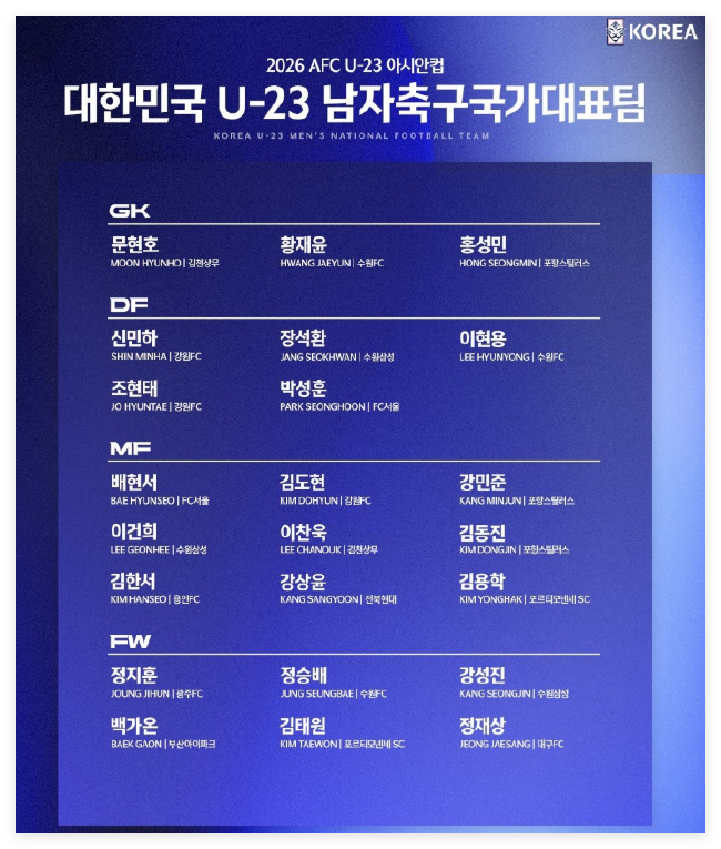 韩国足协公布了投入2026年U23亚洲杯的大名单,其中2名留洋球员入选,姜尚润、姜成真在列。