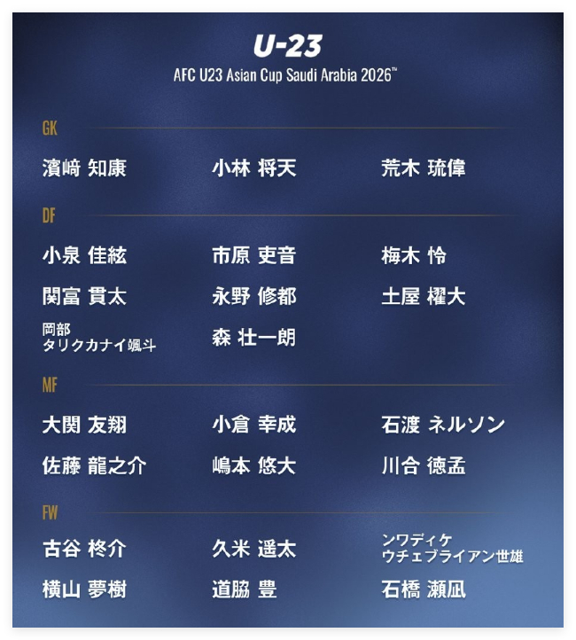 日本U23亚洲杯大名单