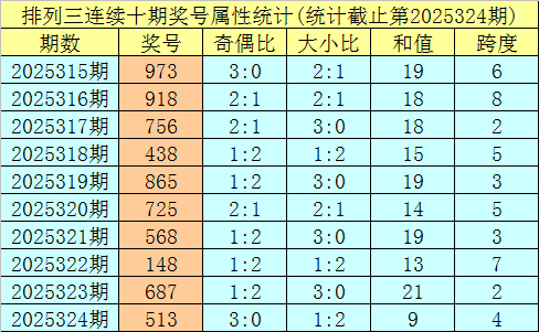 上期追念:成列三第2025324期奖号:513。类型:组六,奇偶步地:奇奇奇,大小步地:大小小,和值:9,跨度:4。