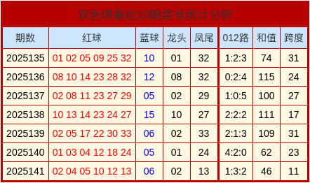 开奖总结:双色球第2025141期奖号为:02、04、05、10、12、13 + 06。