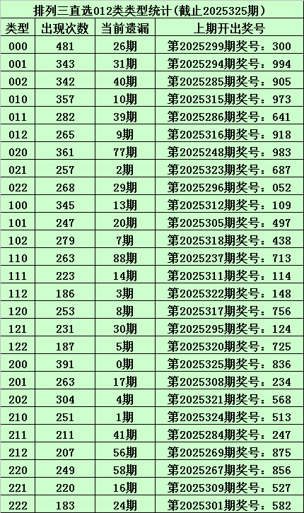 上期回归:体彩胪列三第2025325期开出奖号:836,其012路比为2:0:1,奖号012路类型为:200。