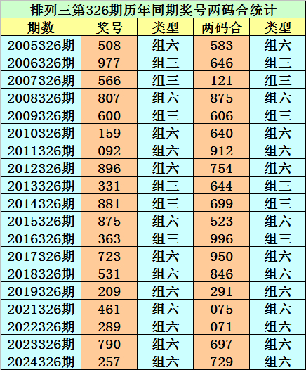 摆设三从2004年开奖于今已开出7449期奖号了,其中第326期历史同时奖号出现19次,积年第326期永别开出号码:508、977、566、807、600、159、092、896、331、881、875、363、723、531、209、461、289、790、257。