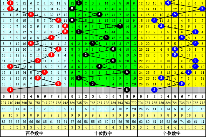 两码合开出频次永别为:6出现10个,9出现9个,4、5、7出现6个,0、1、2出现5个,8出现3个,3出现2个,其中历史同时两码合大小比开出34:23,奇偶比开出28:29,012路比开出26:17:14;